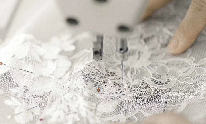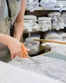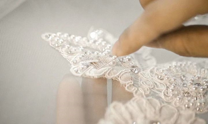 Trim carefully along every detail and outline of lace, and then sew and fix it by hand. Only by sewing and fixing by hand can lace be firmly and evenly fixed on the wedding to the greatest extent.